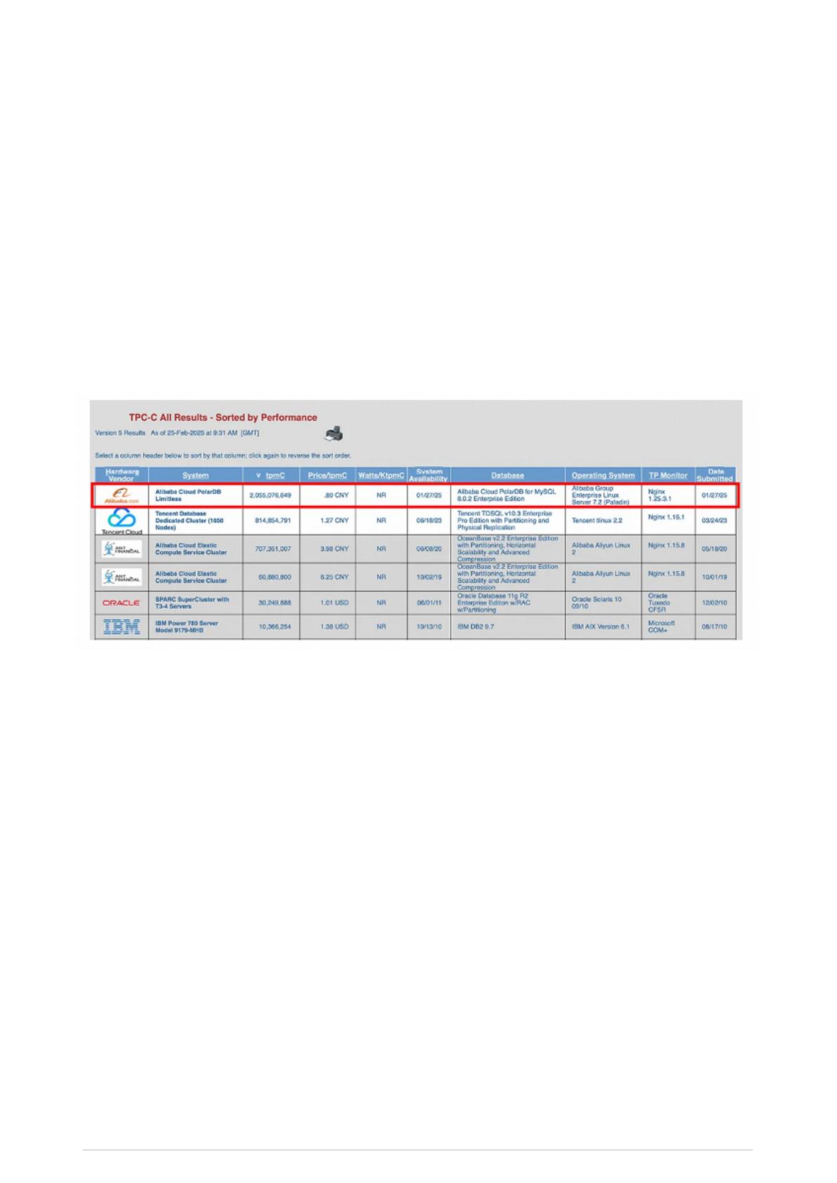 ⾏榜,以每分钟20.55亿笔交易(tpmC)和单位成本0.8元⼈⺠币(price/tpmC)的成绩刷