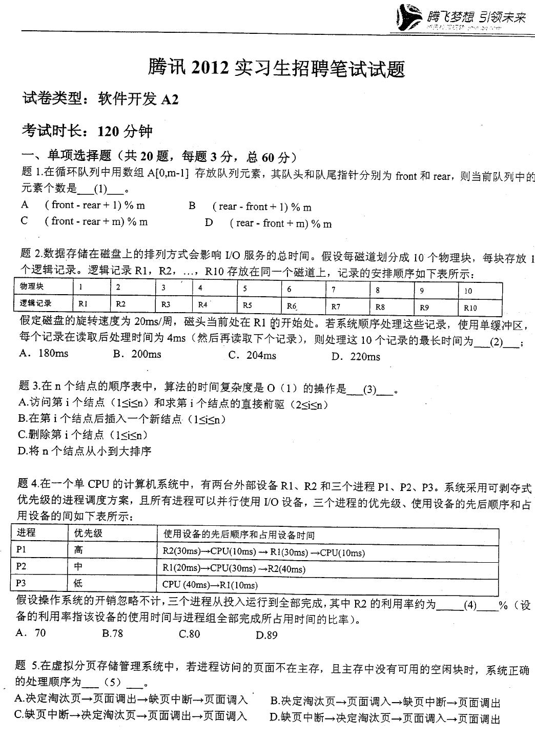 腾讯2012实习生笔试题+答案解析.pdf
