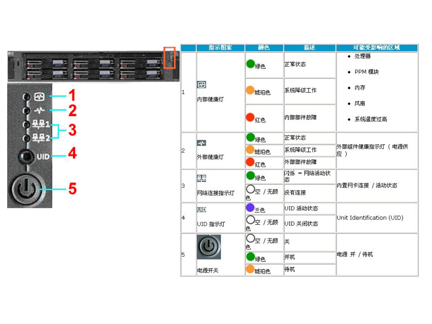 快速诊断板 电源、风扇、内存、 CPU 、 pci-raiser 、及温度过热的状态指示灯