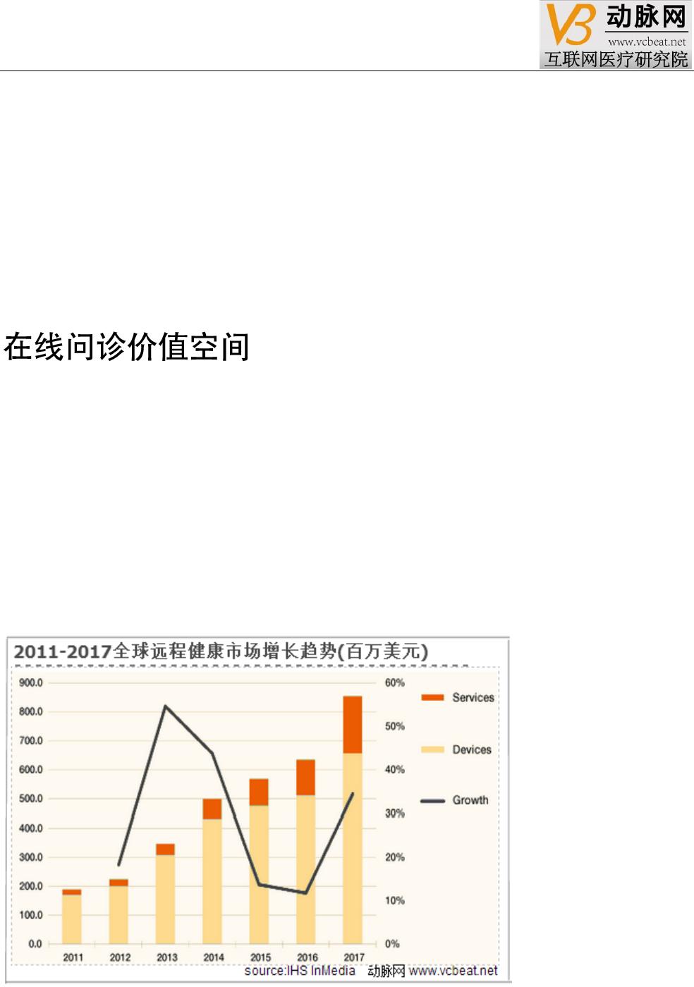 在线问诊模式是远程健康服务模式的一种。根据 InMedia 2013 年的研究报告, 全球远程健康