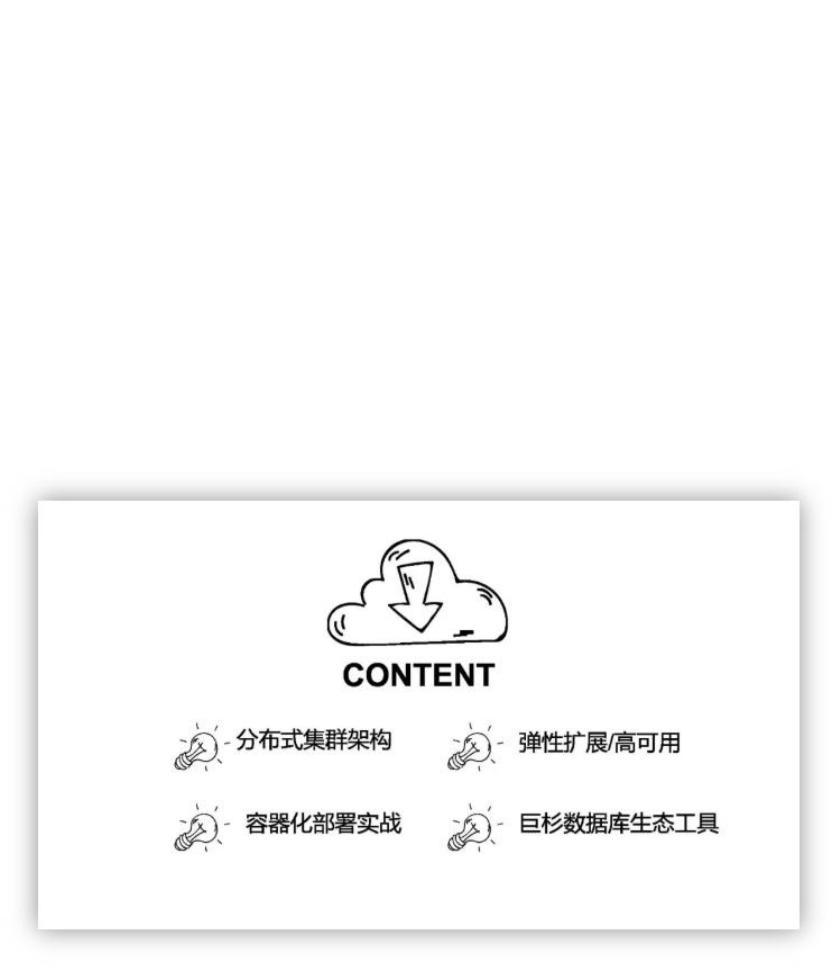 高可用性,然后给大家实战演示一下用 Docker 部署巨杉数据库分布式集群,最后分享一下