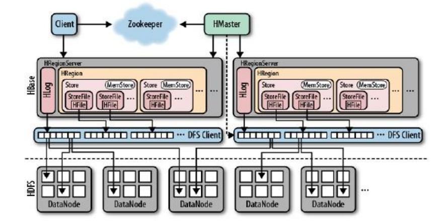 则是真正存储数据的地方。而这些文件都被 HRegionServers 来处理。从图中可以