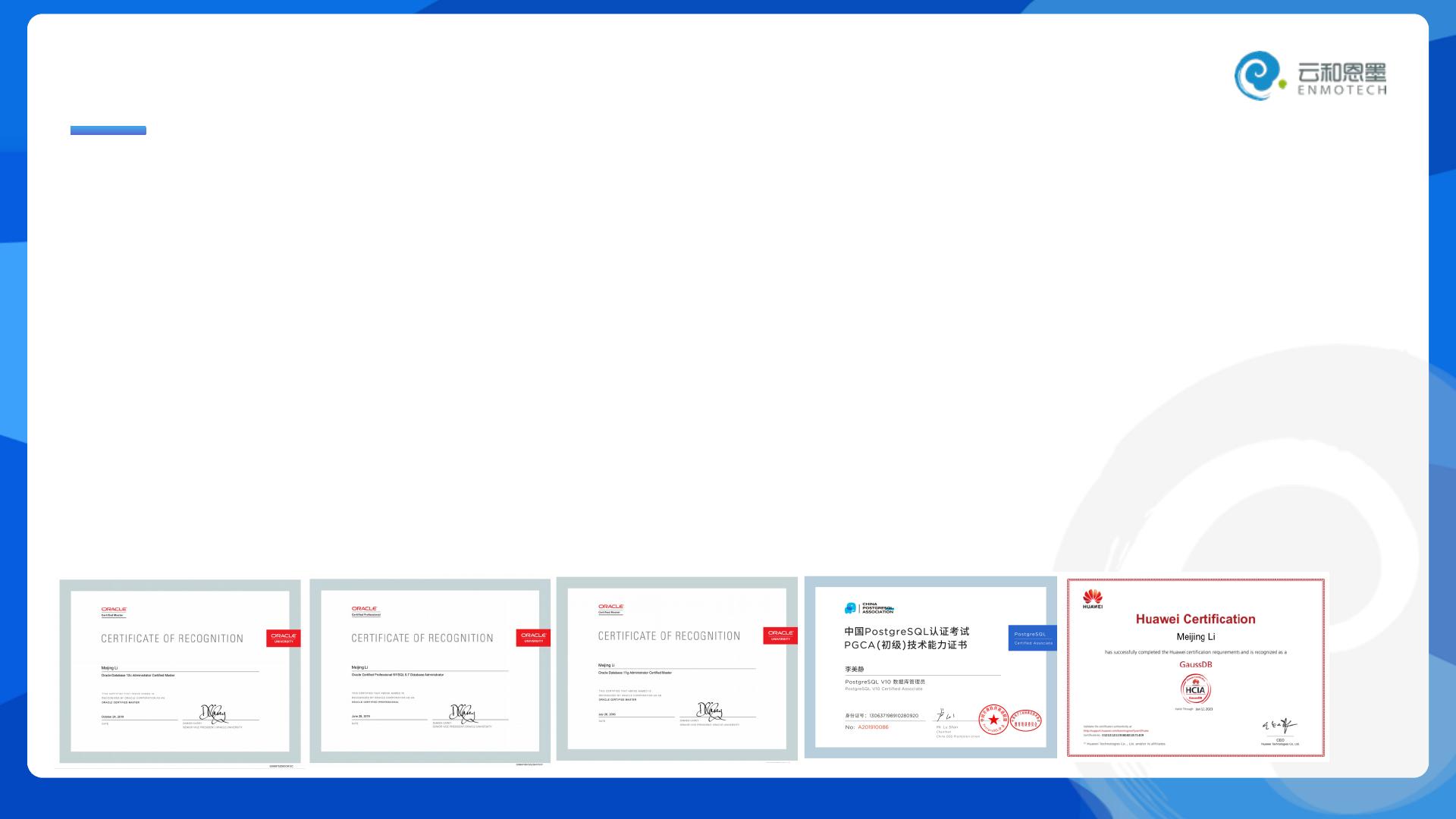 认证、 PG 分会认证讲师、华为 GaussDB T HCIA 认证、达梦 7 DCA 及 DCP 认证。