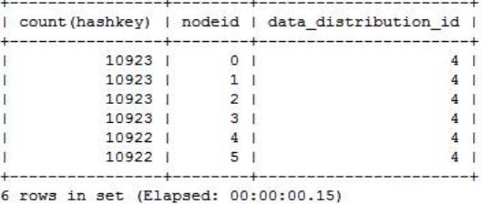 gbase> select count(hashkey),nodeid,data_distribution_id from gclusterdb.nodedatamap group
