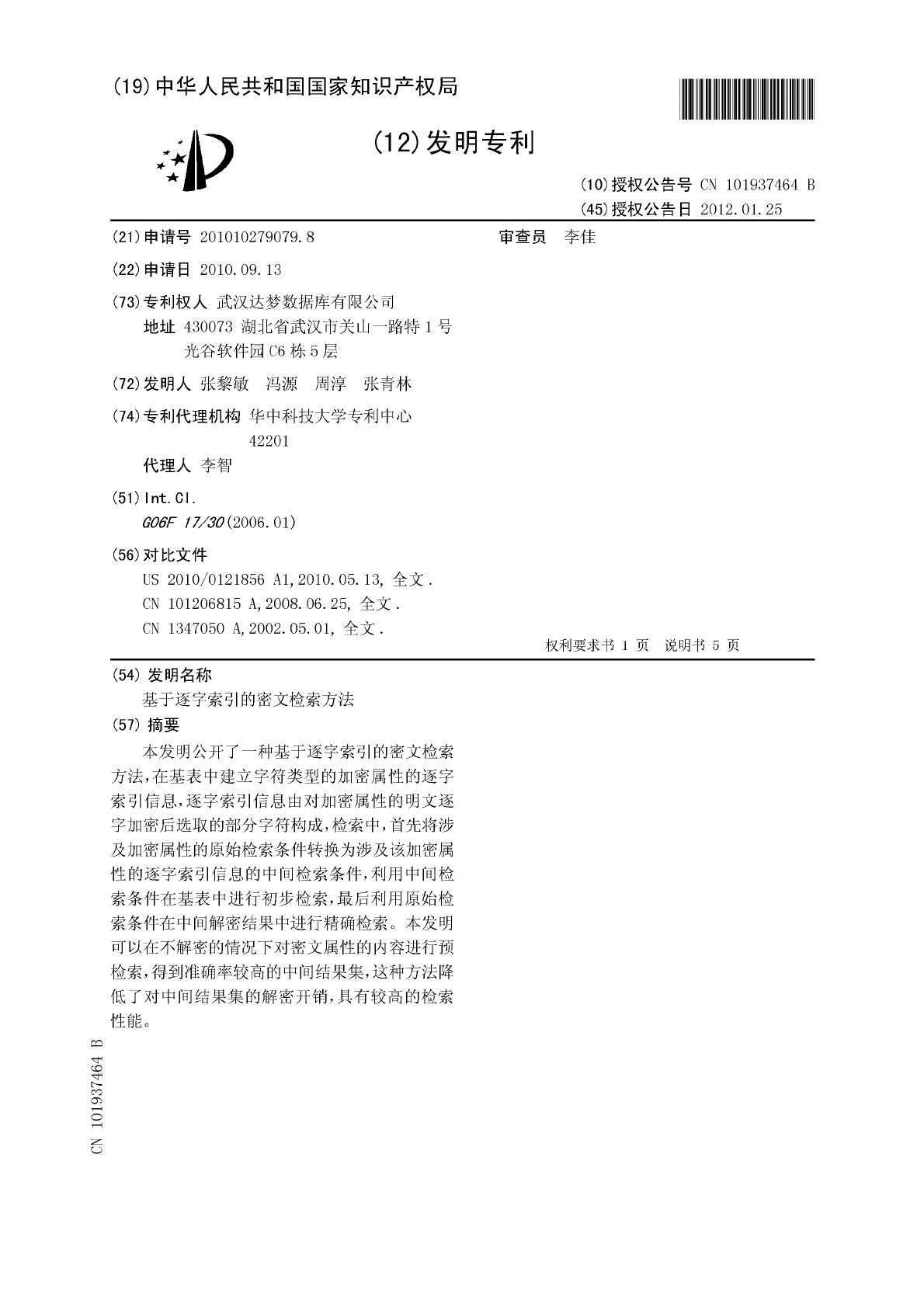 基于逐字索引的密文检索方法_CN-101937464-B_张黎敏_武汉达梦数据库有限公司.pdf