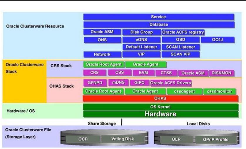 (2) lower stack: 由 oracle high availability services daemon 进程:ohasd 维护。