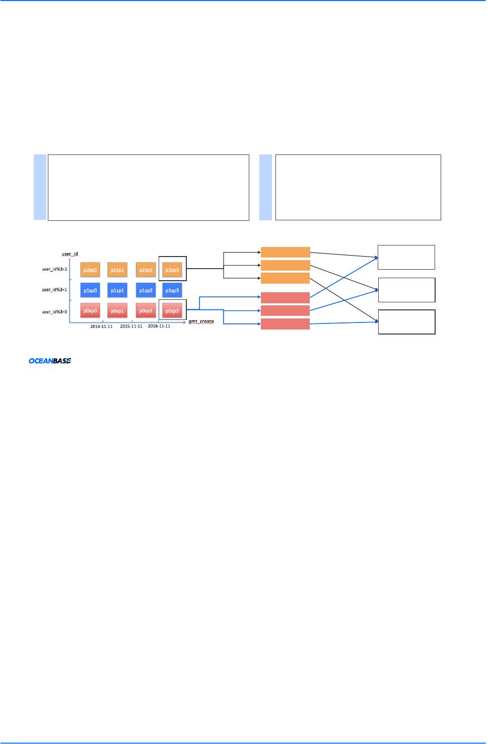 色、蓝色和黄色的三个分区,每一个 hash 分区再按照交易时间分为 4 个 range 分区,也就是