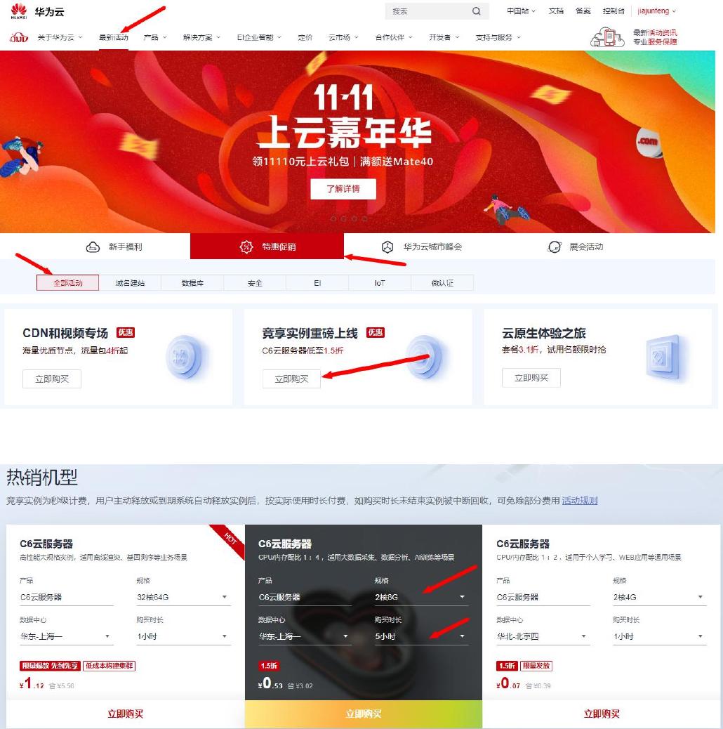 依次选择:最新活动--->特惠促销--->全部活动--->竞享实例重磅上线--->立即购买