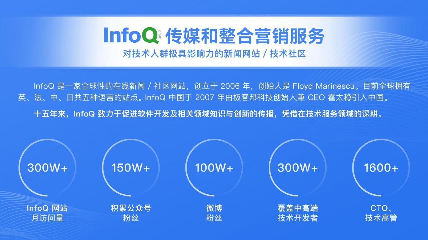 2022年7月31日 - 08月01日,广州。QCon 是由极客邦科技旗下 InfoQ 中国主办的综合性技术盛会,每年在伦敦、北京、纽约、圣保罗、上海、旧金山召开。自2007年3月份开始举办以来,已经有超万名有多年从业经验的技术人员参加过QCon大会。QCon 内容源于实践并面向社区,演讲嘉宾依据热点话题,面向5年以上工作经验的技术团队负责人、架构师、工程总监、开发人员分享技术创新和实践。