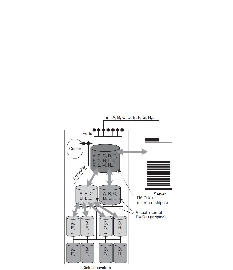 “图一”是 RAID 0+1(加速镜像,即先条带再镜像)原理图。图中有八块物理磁盘,首先 RAID 控制器通过