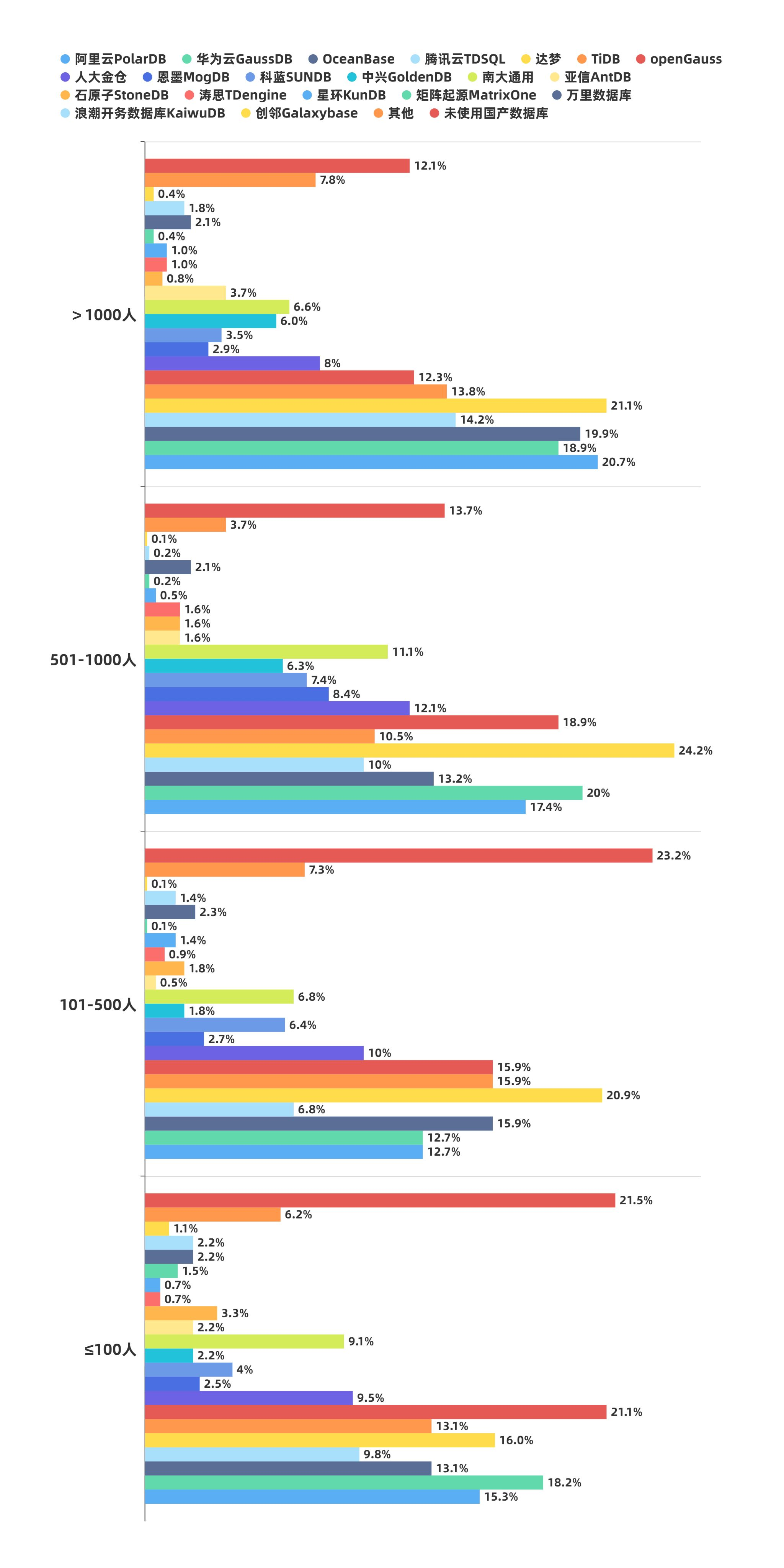 根据调查数据,≤100人的企业中,21.1%的受访者表示,其企业正在使用openGauss 数据库。openGauss作为一款开源关系型数据库管理系统,生态建设比较完善,能大大降低微型企业的使用成本。而在大于1000人的企业中,达梦、阿里云PolarDB的使用率更多,分别占比21.1%、20.7%,OceanBase、华为云GaussDB紧随其后。