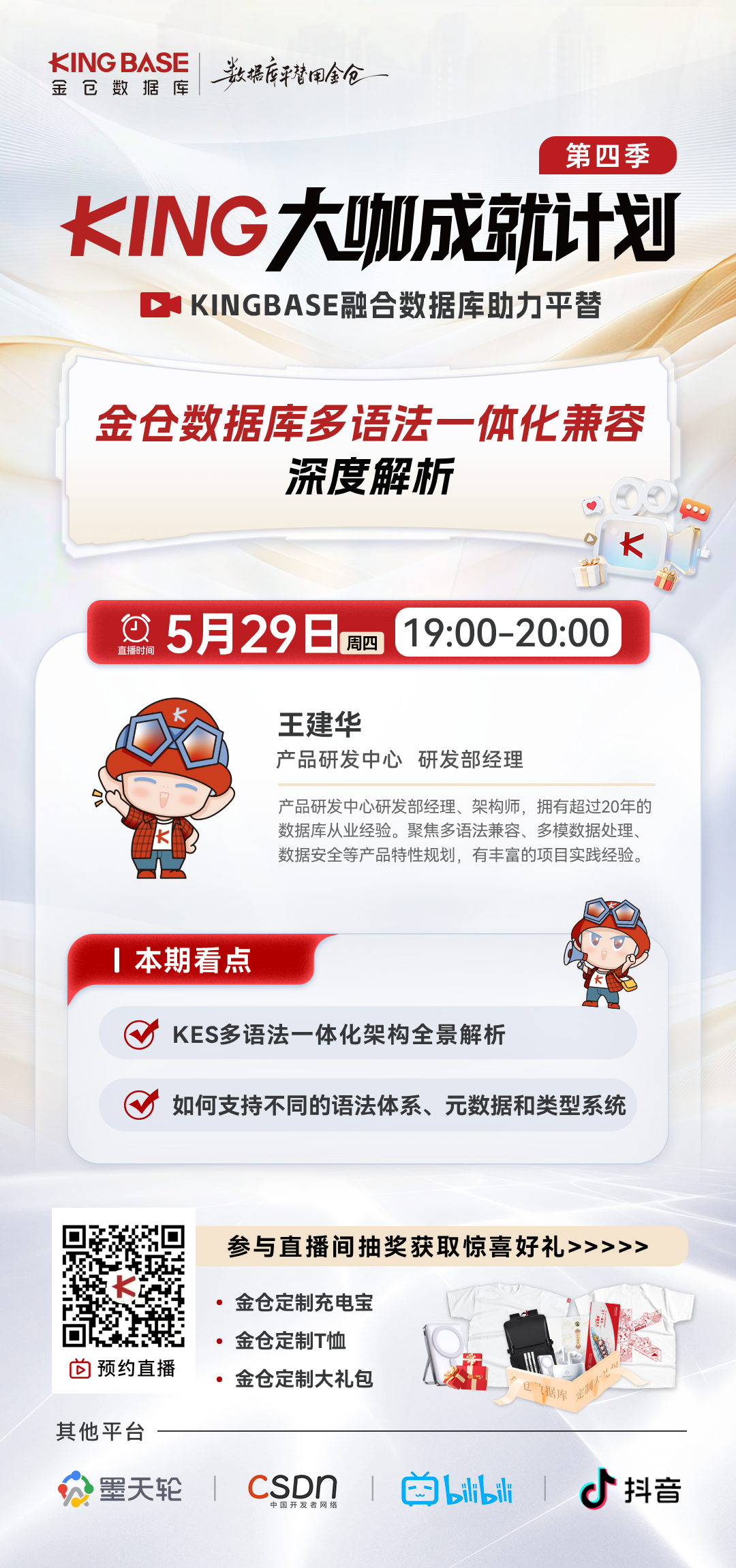 直播间还设有抽奖环节,金仓定制充电宝、定制 T 恤、定制大礼包等好礼等你来拿!速来预约,共探国产数据库创新实践!