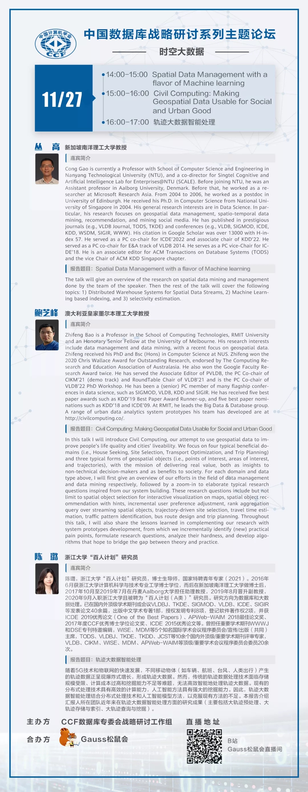 Gauss松鼠会携手CCF数据库专委会,共同打造中国数据库战略研讨系列主题论坛,本期的主题是时空大数据,届时,三位业界资深大咖将从不同维度,围绕时空大数据进行主题分享,同时,本次活动也是Gauss松鼠会第八期技术群英会活动。