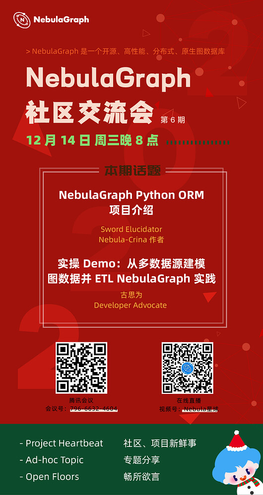 NebulaGraph 社区的月度线上交流会想为社区提供一个月度同步实时沟通的机会,欢迎任何人带着你的创造、你的话题、你的好奇心来加入我们!