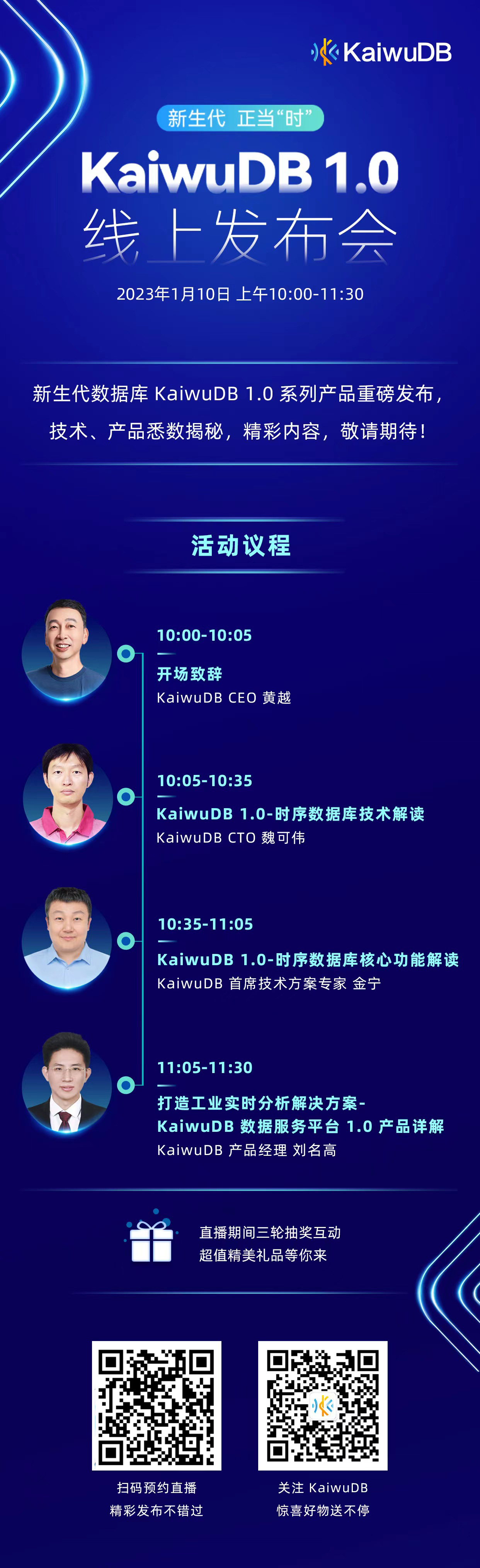 新生代数据库,扬帆起航正当“时”,2023 年度首场重磅亮相,特邀四位重量级嘉宾线上分享,揭秘 KaiwuDB 1.0-时序数据库,期待与你共同见证!