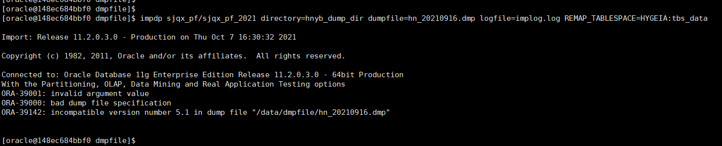 要把一个从12c里导出的文件导入到11g,导出时指定了版本号version=11.2.0.3.0 ,导入的数据库版本也是11.2.0.3.0,但导入时也报错ORA-39142