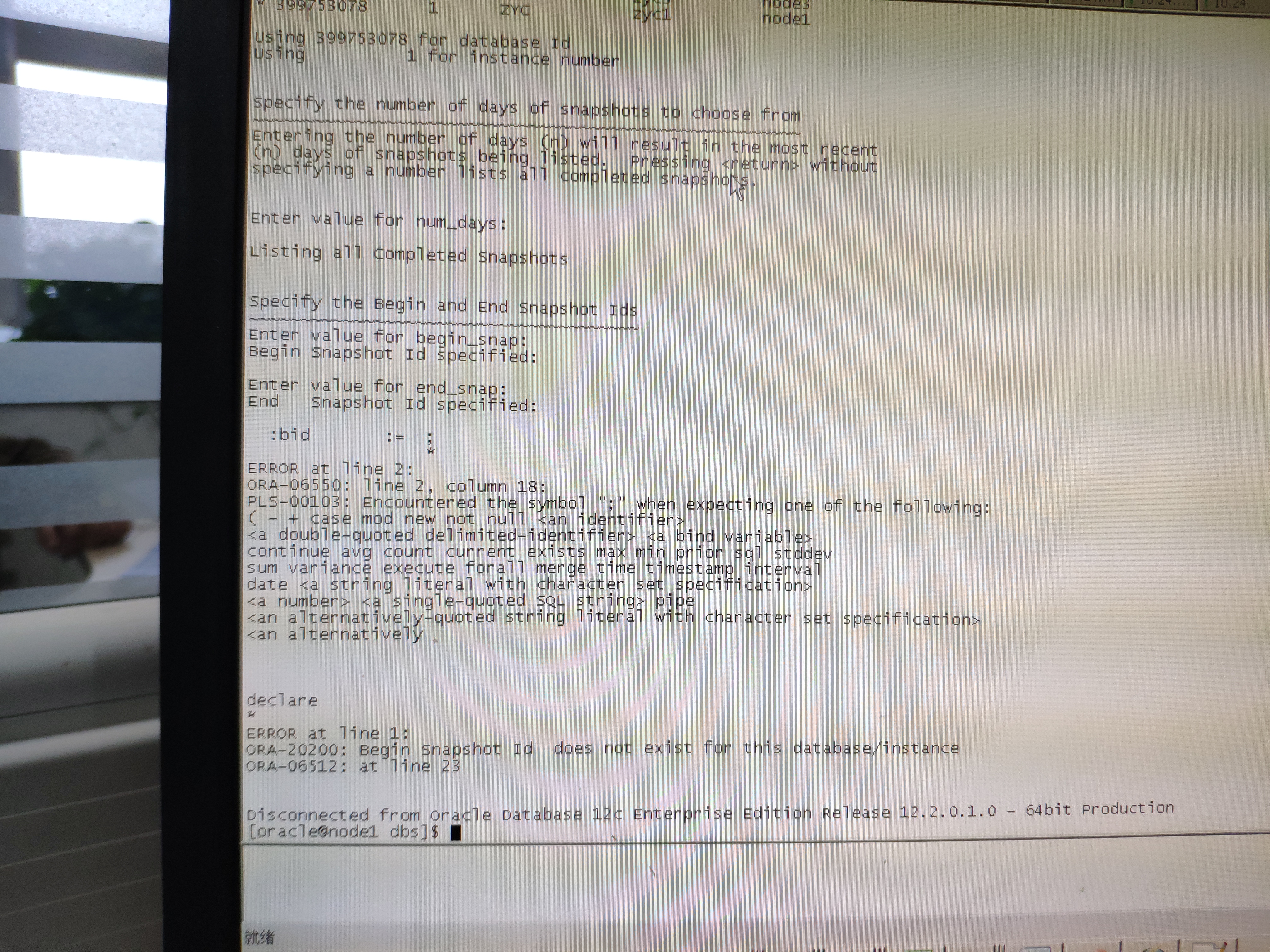 抓取awr报告报错“ora-06550,ora-20200-begin snapshot id does not exist for this database/instance,ora-06512”
