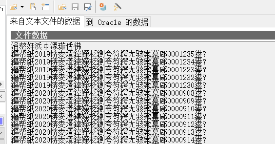 文件数据窗口的右上角,有个选项“ENCODING”,可以选ANSI或UTF 8, 你切换下选项试试。另外在CMD窗口输入set NLS_LANG, 或者到注册表里查询NLS_LANG这一项的内容。最好再查下OS上字符集设置: cmd窗口敲chcp命令,得到字符集代码