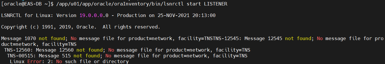 1、安装数据库软件完成后,无人值守安装监听程序。监听安装完成后,启动报错