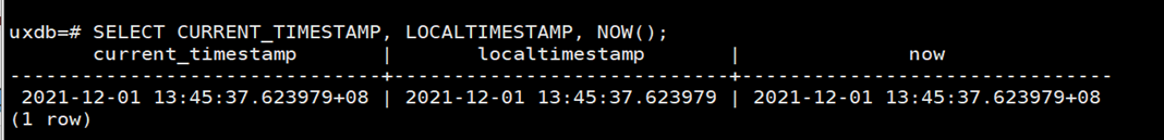 UXDB提供了三个用于获取当前日期时间的函数:CURRENT_TIMESTAMP、LOCALTIMESTAMP、NOW(),