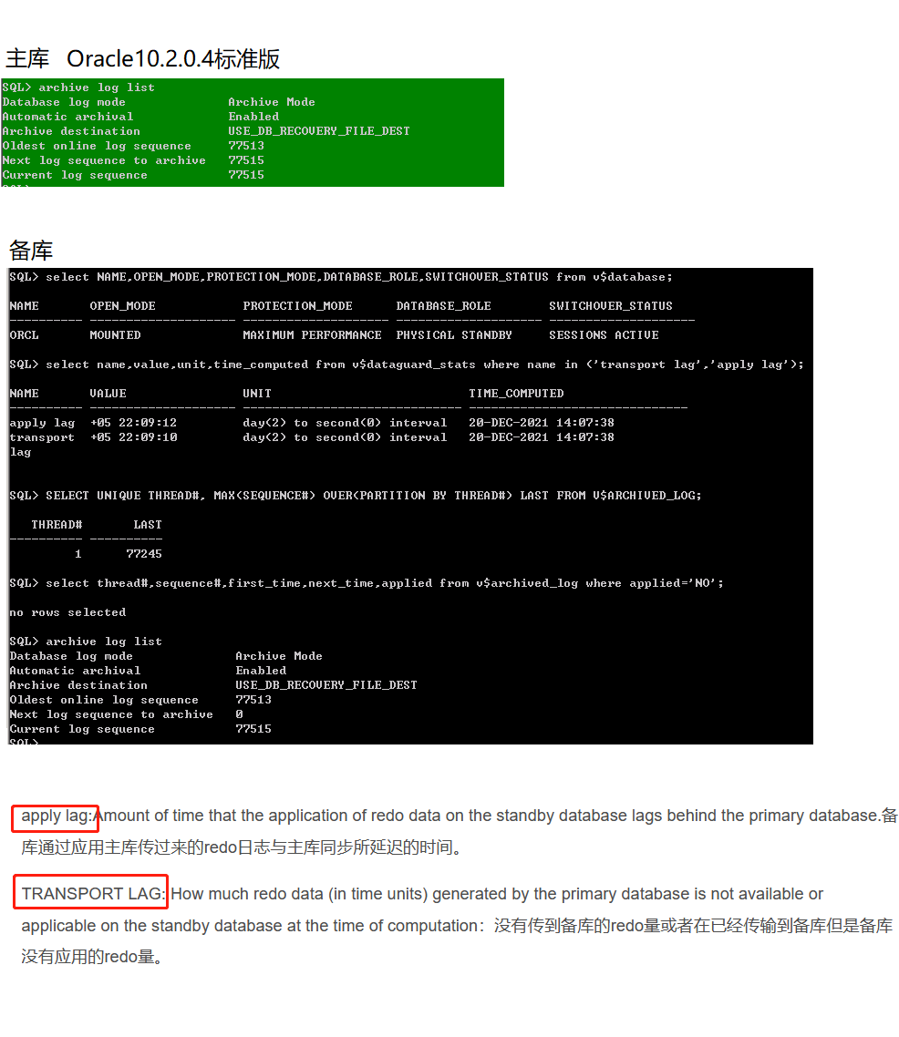 【问题描述】通过archive list log和v$archive_log视图看,日志都已经应用了,但是v$dataguard_stats里面显示还有未应用的。