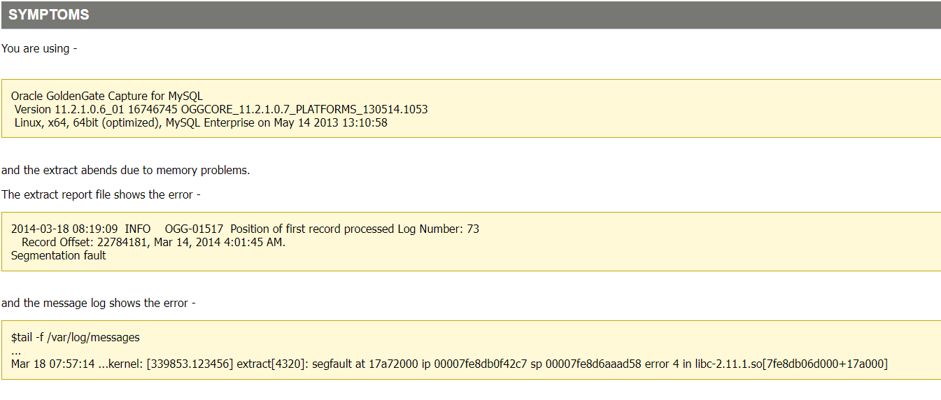 匿名用户OGG for mysql 12.2: OGG日志没有任何报错信息,在/var/log/message看到报错:error 4 in libc-2.17.so