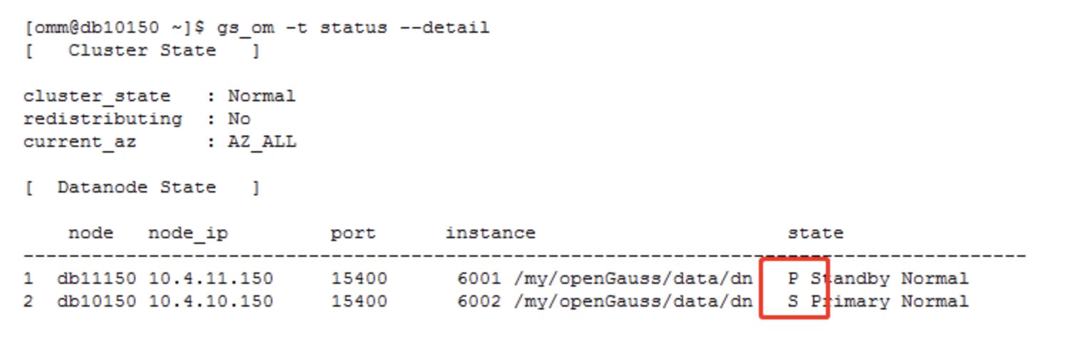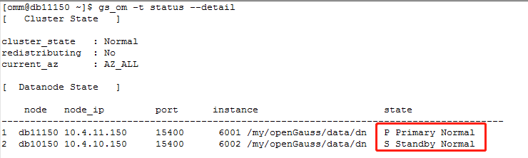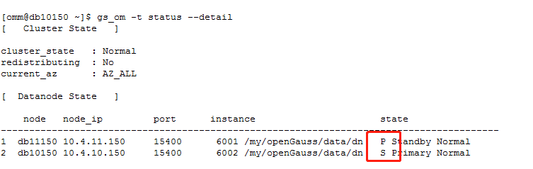 [omm@db10150 ~]$ gs_ctl switchover -D /my/openGauss/data/dn/