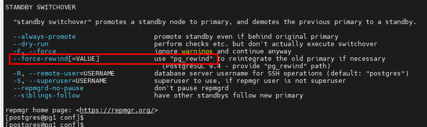 [postgres@pgdb01:/postgresql/log]$repmgr -f /postgresql/pg12/repmgr.conf standby switchover --siblings-follow --force-rewind