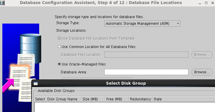 2节点11g的RAC测试环境,现在需要rac新建一套数据库,可是在dbca选存储的地方,找不到asm磁盘组了