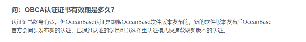 OBCA 认证证书终身有效。但 OceanBase 认证是跟随 OceanBase 软件版本发布的,新的软件版本发布后 OceanBase 官方会同步发布新的认证,已通过认证的学员可以选择重认证模式快速获取新版本的认证。