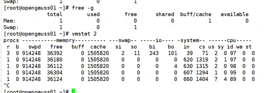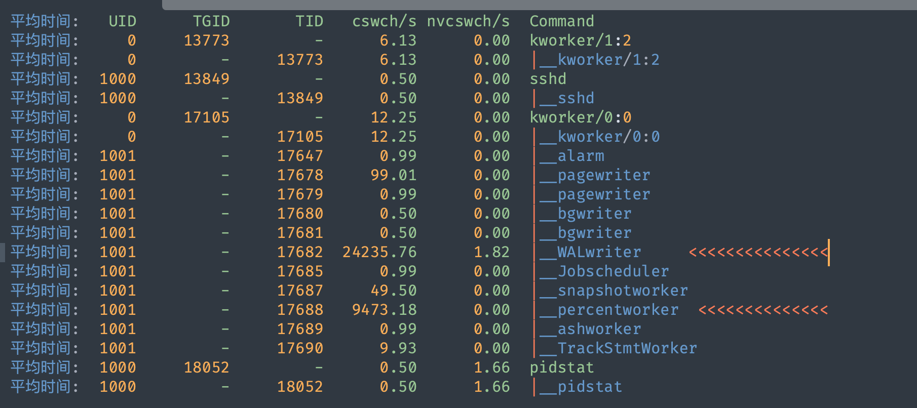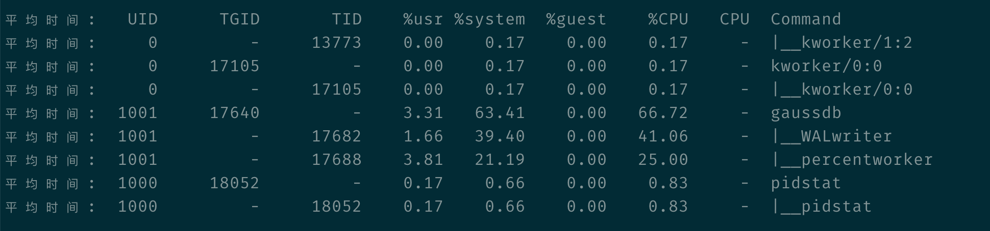 发现是 opengauss 进程中的两个线程 (WALwriter 和 percentworker ) 在占用cpu。
