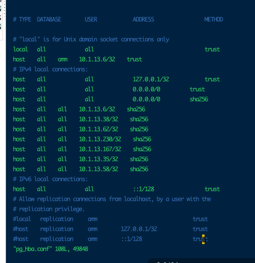 远程连接数据库的认证方式需要sha256, 但是数据库主备数据同步的认证方式是trust。