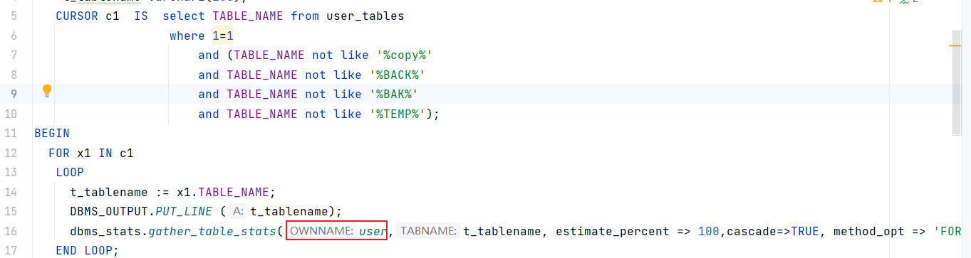 1、编写一个批量更新表统计的存储过程,由于是一个数据库中有多个用户,因此使用了通用的名字