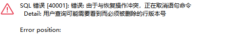 错误码 40001 表示的是 PostgreSQL 的事务冲突错误,可能由于并发事务导致的。在主从数据库的场景中,可能是因为从库的某个查询操作与当前正在执行的事务冲突导致的。