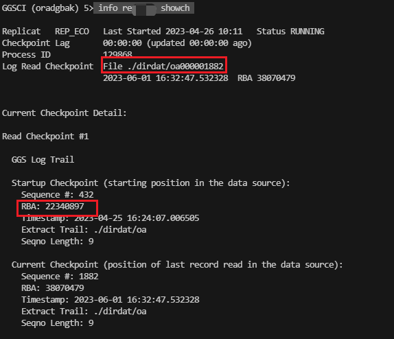 2、 info rep_test showch ,找到当前写到的文件,以及rba