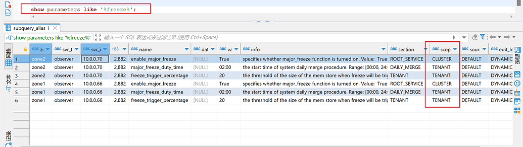 有些参数是租户层面的,普通租户可以自己修改,但是SYS租户也可以为普通租户修改。比如参数:freeze_trigger_percentage major_freeze_duty_time 。运维要特别注意这点,4.x版本后合并可以在租户级别进行,所以一些租户参数的修改要到具体租户下或者SYS租户下修改时要指定业务租户名(别只改了 SYS 租户)。