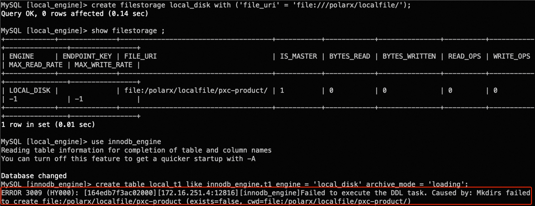 PolarDB冷表创建不了,报这个错是咋回事? 1.cn节点使用nfs共享存储目录 2./polarx/localfile/pxc-product/已存在且已赋777权限 3.使用k8s搭建的prolardbx