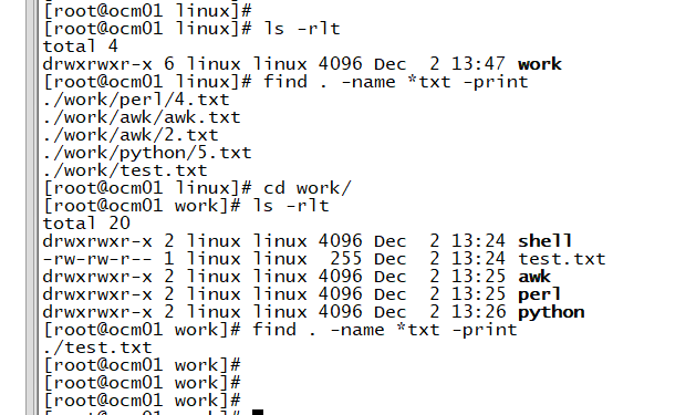 18:30:47 [root@ddcw21 t20231202]#find ./ -name "*txt" ./aa/a.txt ./aa/dd/d.txt ./bb/b.txt ./cc/c.txt 18:32:15 [root@ddcw21 t20231202]#cd aa 18:32:17 [root@ddcw21 aa]#find ./ -name "*txt" ./a.txt ./dd/d.txt 18:32:19 [root@ddcw21 aa]#