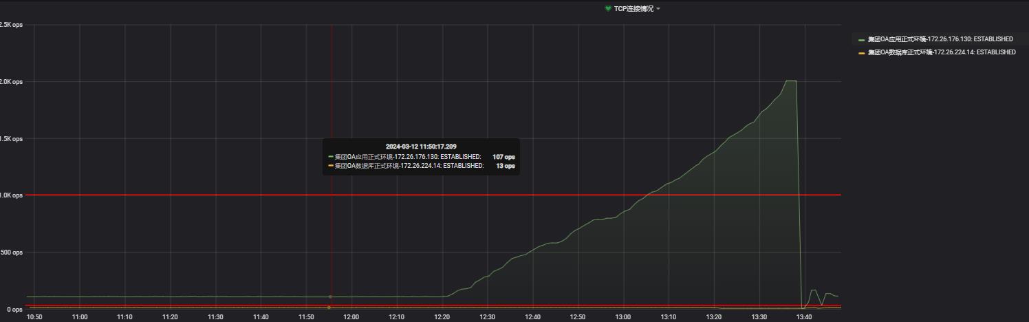通过监控看应用及数据库服务器cpu、内存都没波动,只有建立的TCP连接会突然大量增长,这时候系统就挂了