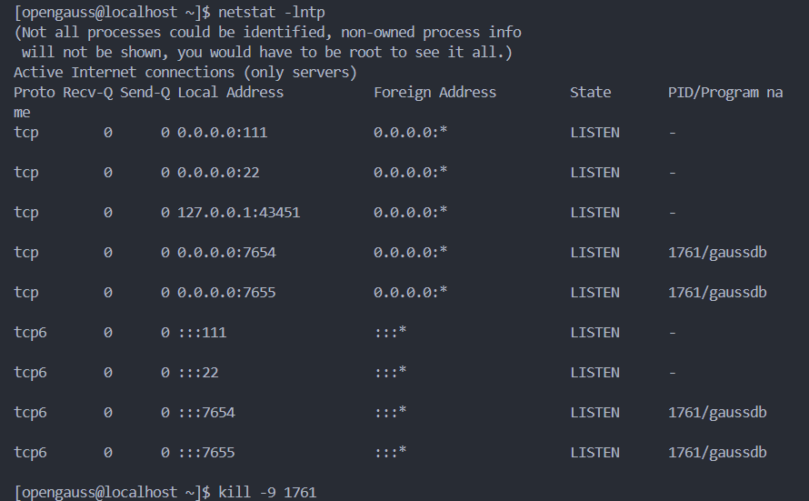 执行netstat -lntp,可以看到openGauss占用7654端口正常运行