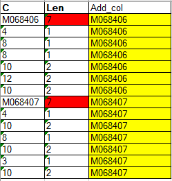 25M假设有个表叫Table_A,现有两列C和len, len是c列的长度,现需增加一列(黄色部分),规则是遇到len = 7增加的列就为C这行的值, 怎么写?谢谢