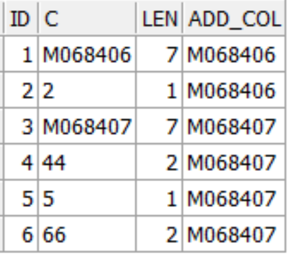 select 'M068406' as c,7 as len from dual union all select '2' as c,1 as len from dual union all