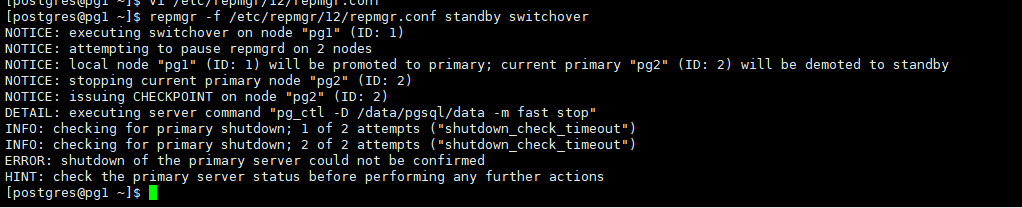 repmgr手动切换遇到以下故障,如果处理,repmgr参数shutdown_check_timeout设置为3s。