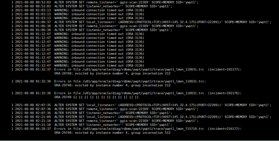 25M一个月rac出现两次问题,都是重启服务器解决,4个节点报错ORA-29740,ORA-3136,12.2.0.1,4节点rac,centos7.4,大神帮忙看下,以下是各节点报错信息