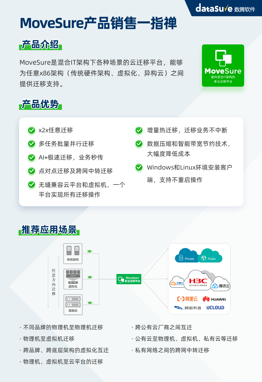 MoveSure是上海数腾软件科技股份有限公司研发的云迁移平台,实现任意X86架构和国产化架构下,异构云、异构虚拟化、物理机与云平台间相互迁移。